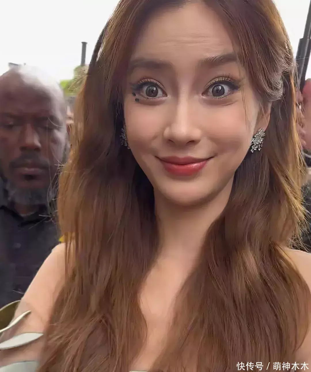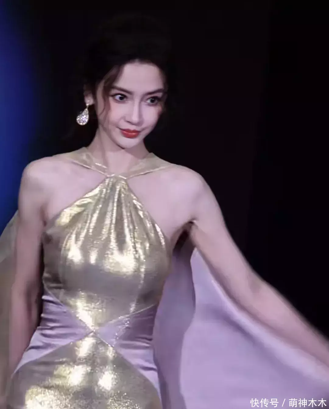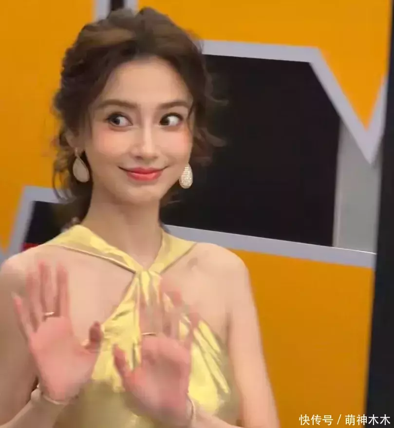 走上红毯的baby,听到有人和她打招呼,立马挤出笑容、瞪大眼睛回应,整个表情都不自然了;